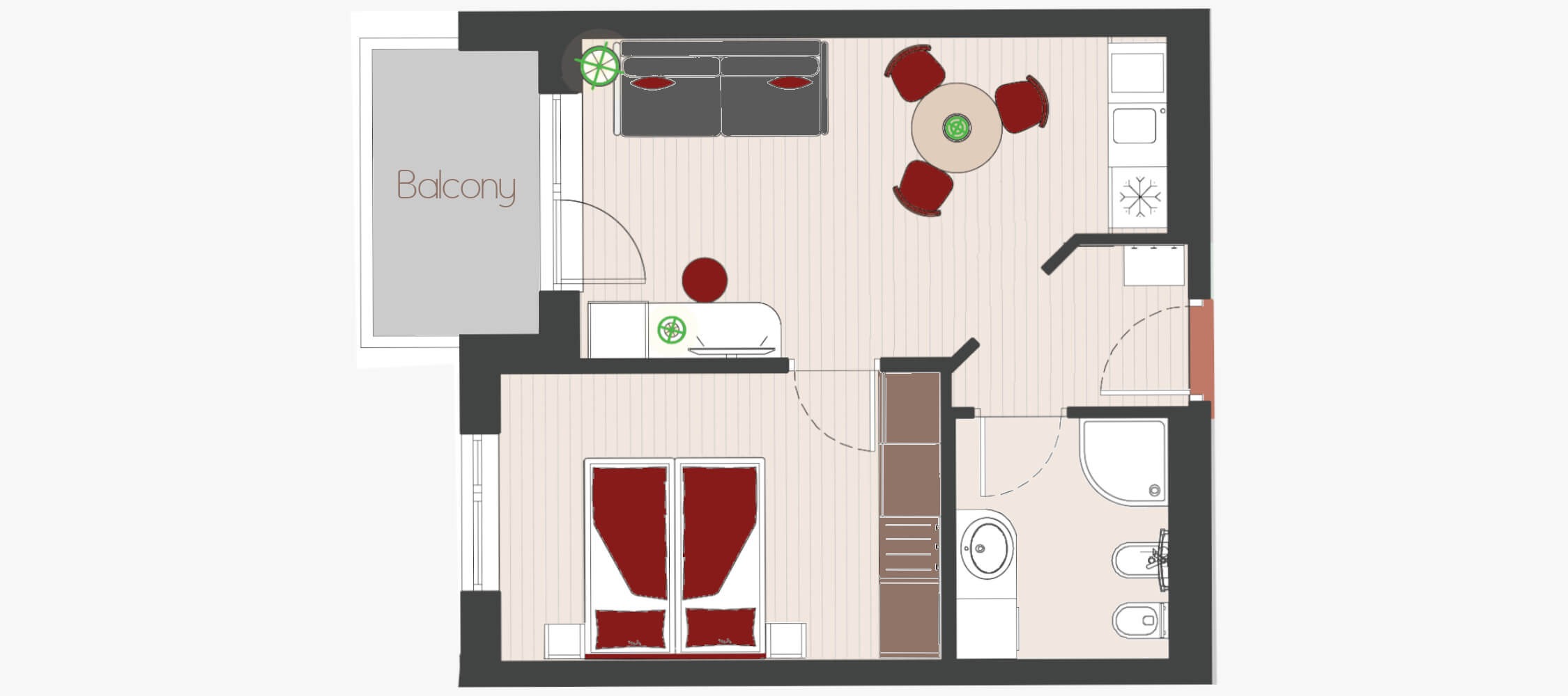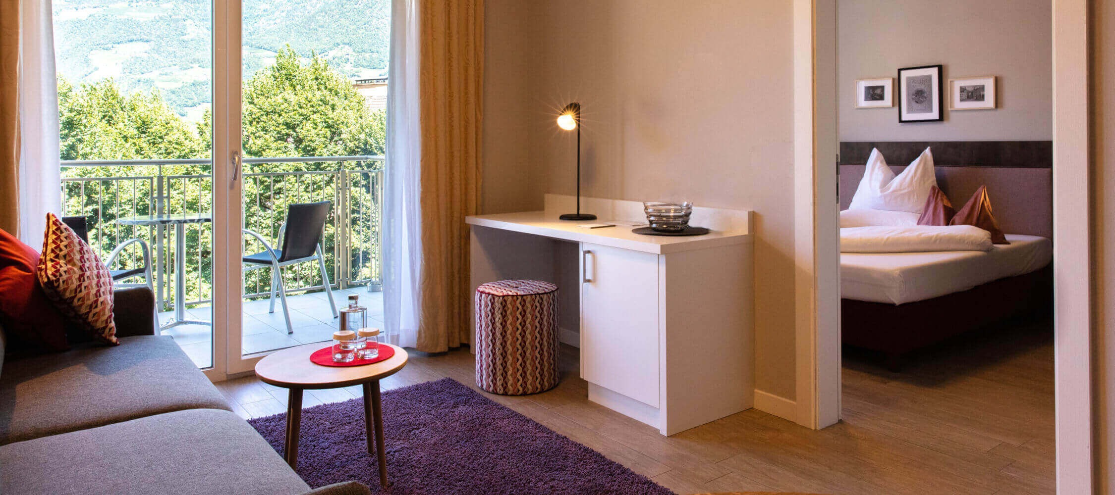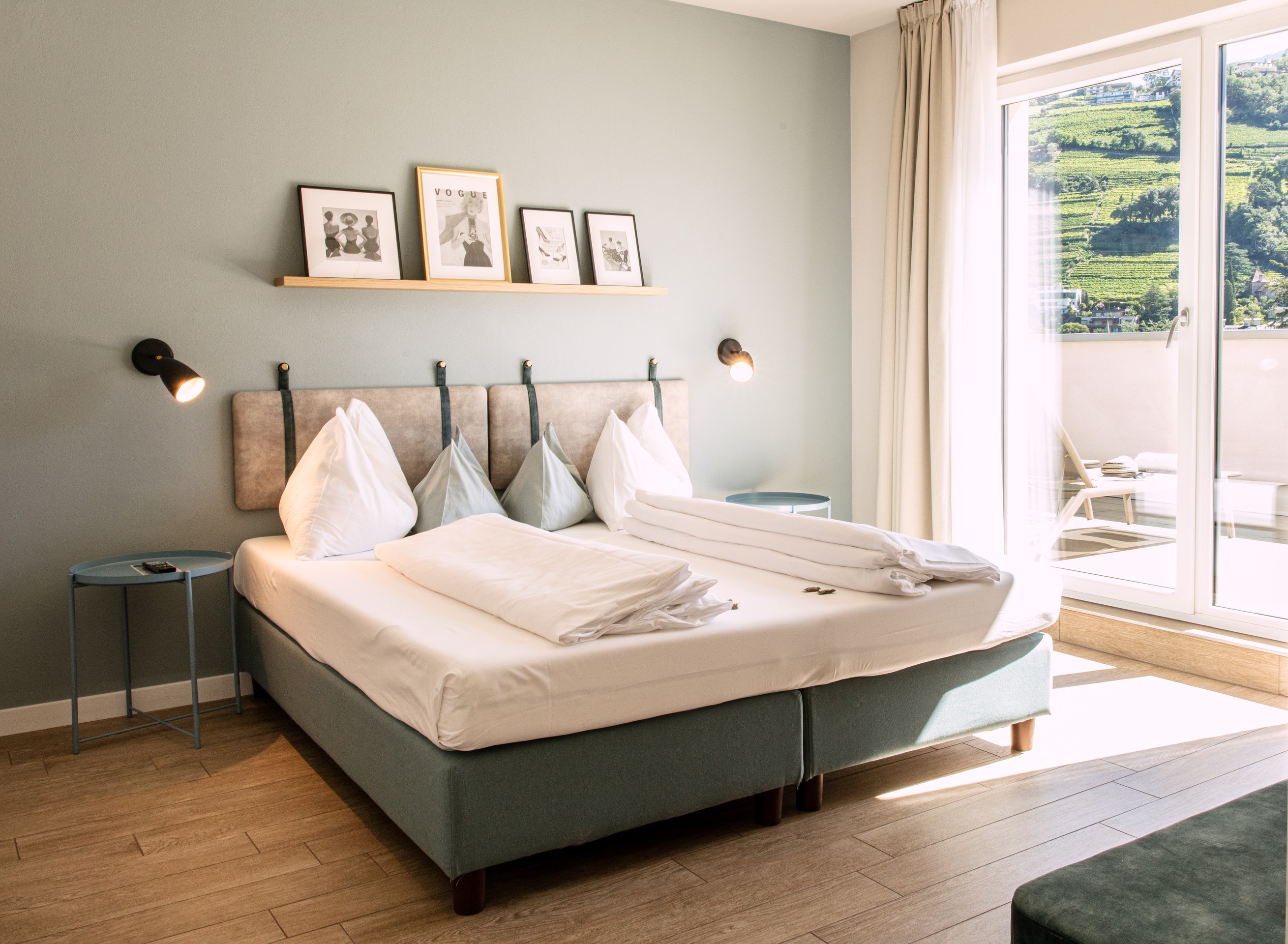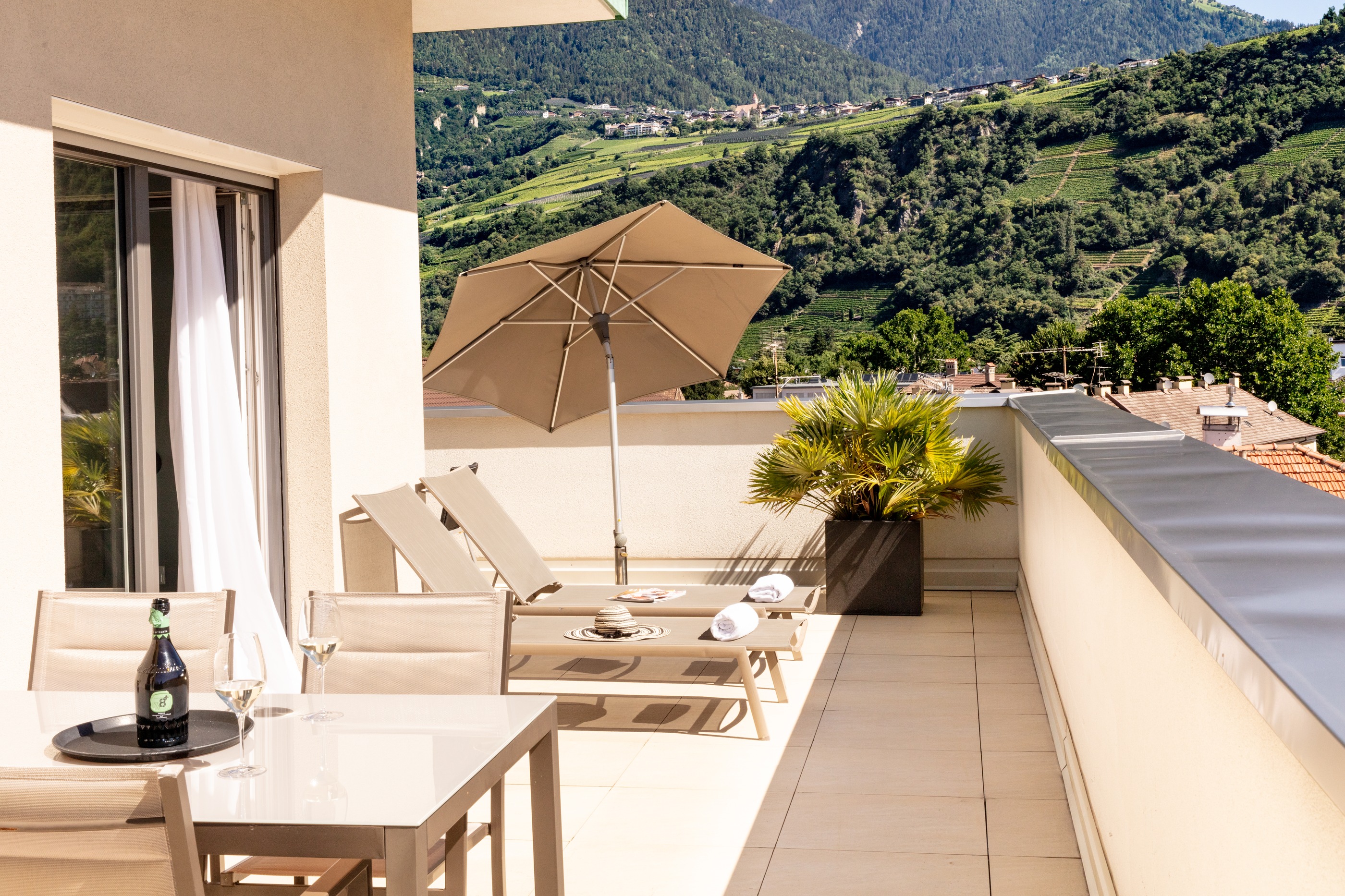 Wohnen Sie in 38 bis 68 m² großen, klimatisierten Suiten mit modernem Design, King-Size-Betten und Balkon mit Blick auf die Meraner Alleen oder Berge.
